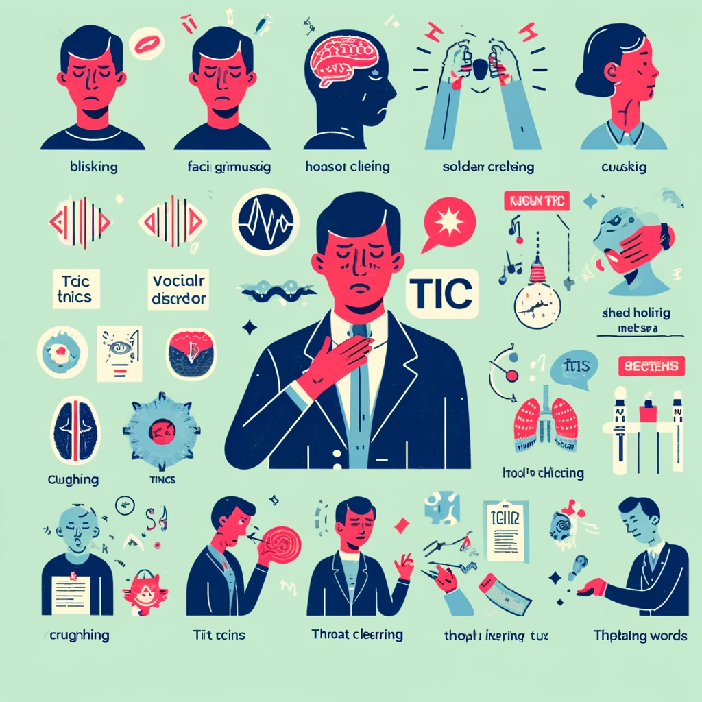 음성 틱은 불수의적인 소리 내는 행동으로, 기침, 인후 청소하기, 비음을 내는 소리, 말을 반복하는 행위 등이 포함됩니다. 음성 틱 역시 간단한 소리(단순 음성 틱)에서부터 복잡한 언어적 표현(복합 음성 틱)까지 다양한 형태를 띨 수 있습니다.